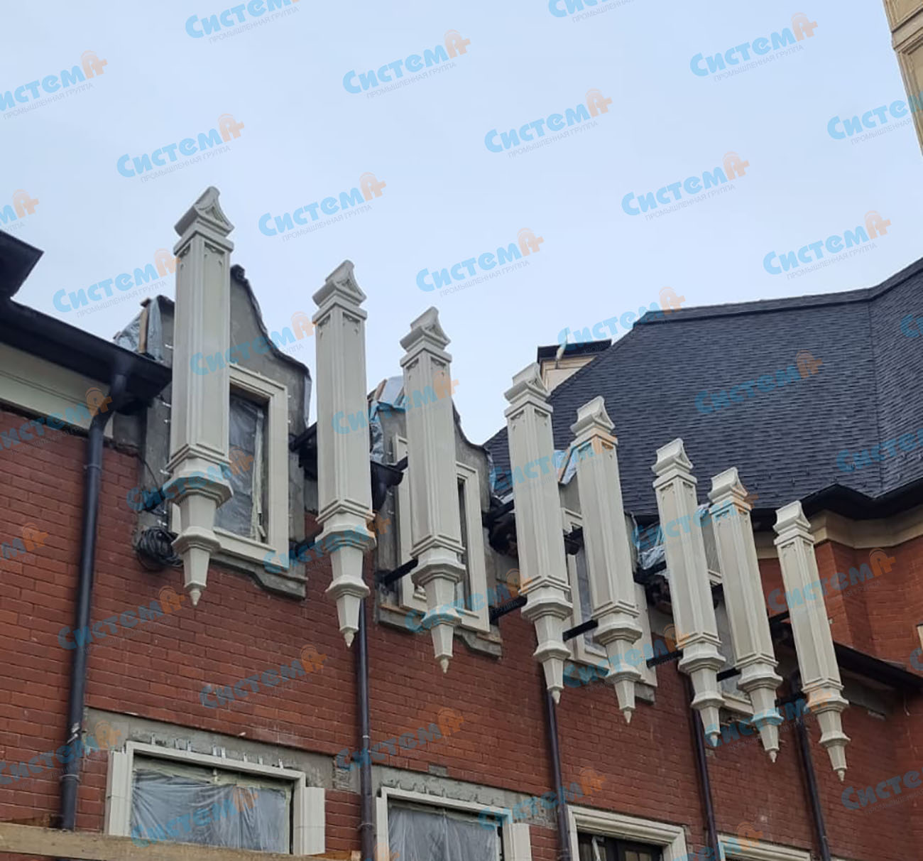 Изначально заказчики планировали устанавливать декор из керамики. Но это оказалось очень дорого, к тому же керамические пинакли имели бы очень большой вес. Перед нами стояла интересная задача — не только изготовить фасадные украшения, но и разработать укрупнения элементов. Это позволило быстрее проводить монтаж, сохранив при этом сложную форму архитектурной детали.